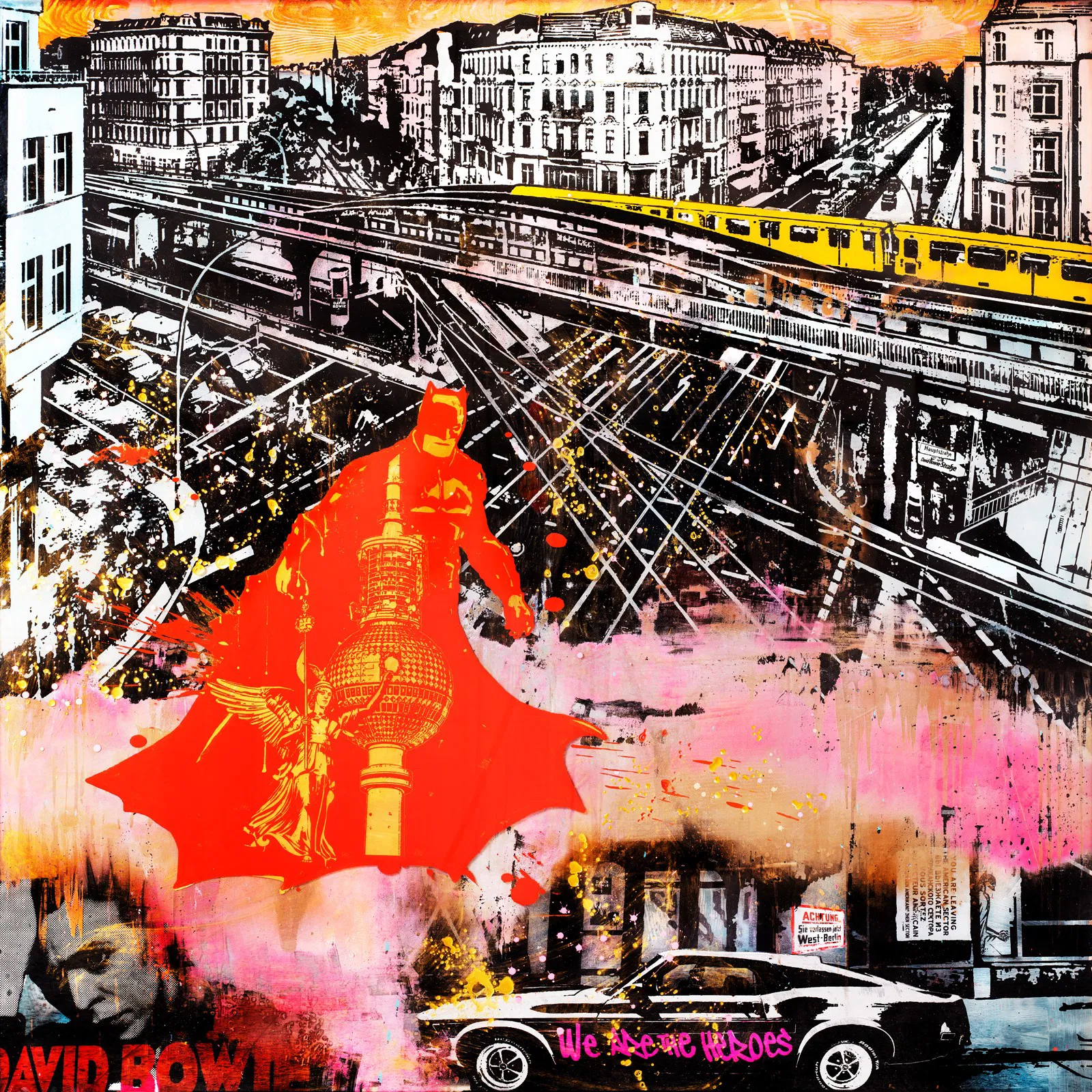 A vibrant, staccato homage to the symbiotic relationship between a city and its icon. The Berlin cityscape is reimagined in a rhythmic explosion of color and geometric forms, where the alien beauty of Bowie becomes one with the urban landscape, making the unfamiliar feel like home.